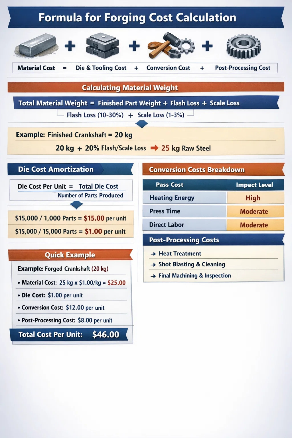 Kinakalkula ang kabuuang halaga ng pagpapanday ng bakal nagsasangkot ng pagbubuod ng apat na pangunahing haligi: Gastos ng Materyal (net weight plus flash loss), Mga Gastos sa Tooling/Die (amortized sa panahon ng produksyon), Gastos ng Conversion (enerhiya, paggawa, at overhead ng makina), at Mga Gastos Pagkatapos ng Pagproseso (heat treatment at machining). Para sa isang karaniwang mid-sized na gear, ang materyal ay karaniwang nagkakahalaga ng 40% hanggang 50% ng kabuuang presyo ng unit, habang ang tooling ay ang pinakamalaking upfront variable.