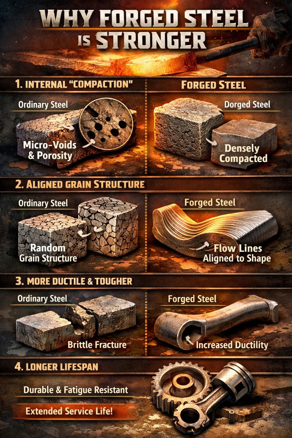 Huwad na bakal: Sa ilalim ng napakalaking presyon, ang mga maliliit na butas na ito ay ganap na na-flatten at hinangin, na ginagawang ang buong piraso ng metal ay kasing siksik ng solidong bloke. Kung walang mga panloob na depekto, ang bahagi ay natural na mas malakas.