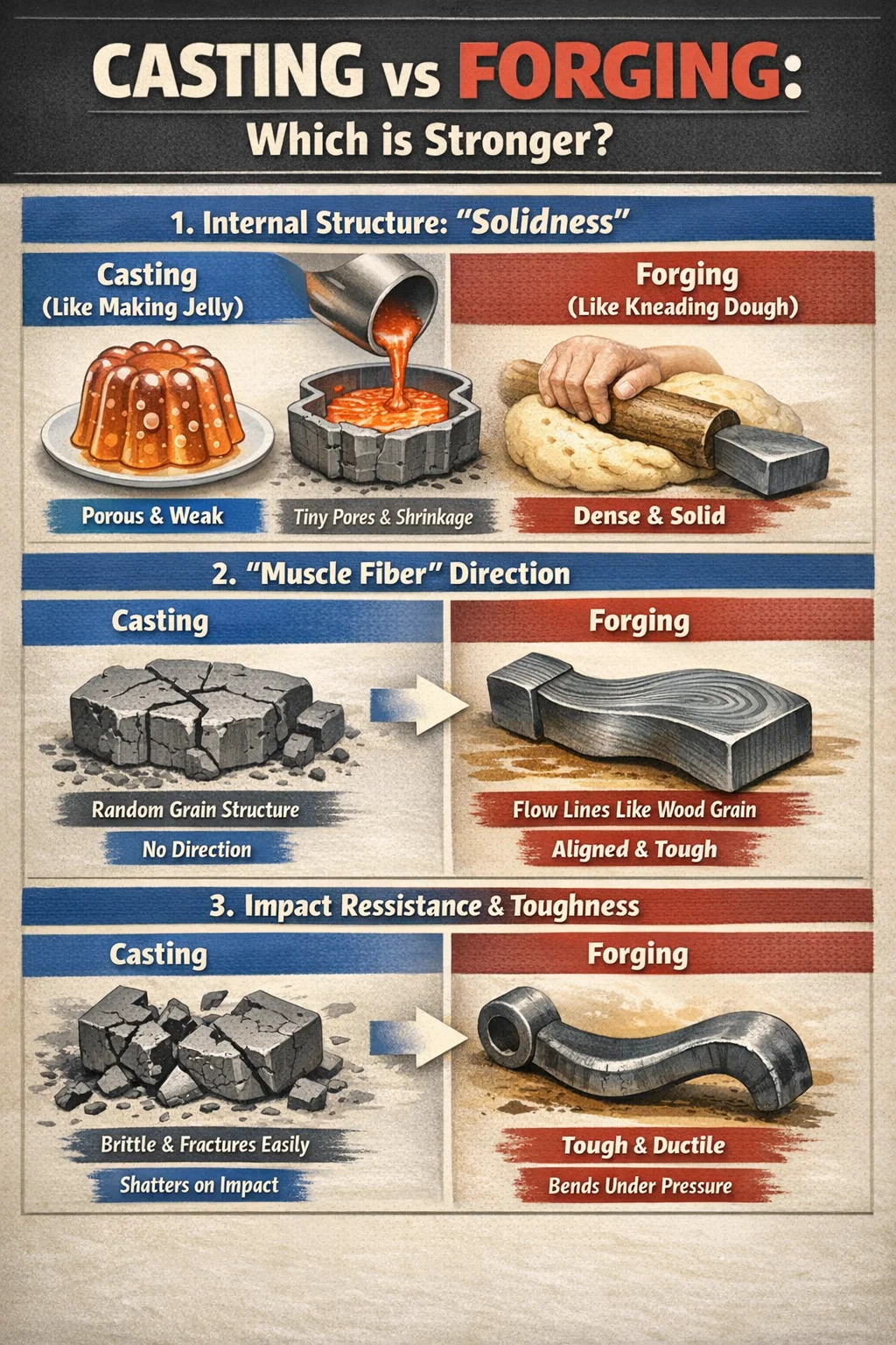 Kung ihahambing natin ang metal sa mga sangkap ng pagkain, ang paghahagis ay parang "paggawa ng halaya," habang pagpapanday ng bakal ay parang "pagmamasa ng kuwarta." Bagama't pareho silang maaaring lumikha ng nais na hugis, ang panloob na density at resistensya ng epekto ay ganap na naiiba.