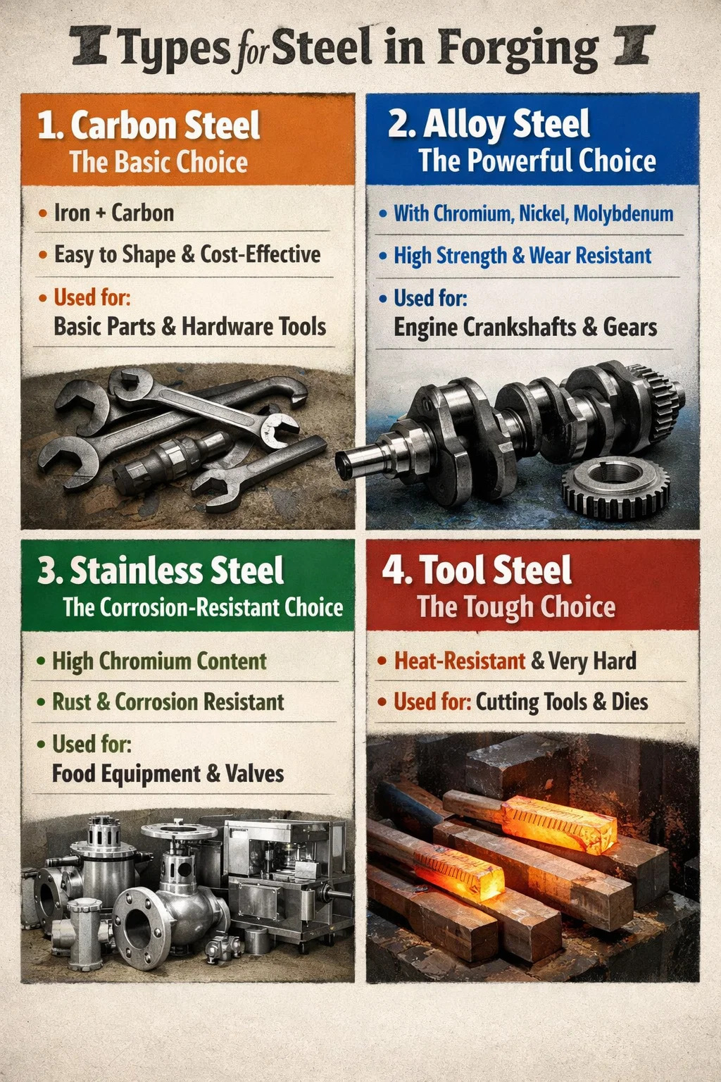 Sa aktwal na pang-industriya na produksyon, hindi lahat ng bakal ay angkop para sa "pagpainit at pagmamartilyo." Upang matiyak na ang mga resultang bahagi ay parehong matibay at matibay, pagpapanday ng bakal karaniwang gumagamit ng mga sumusunod na pangunahing uri ng bakal, depende sa aplikasyon: