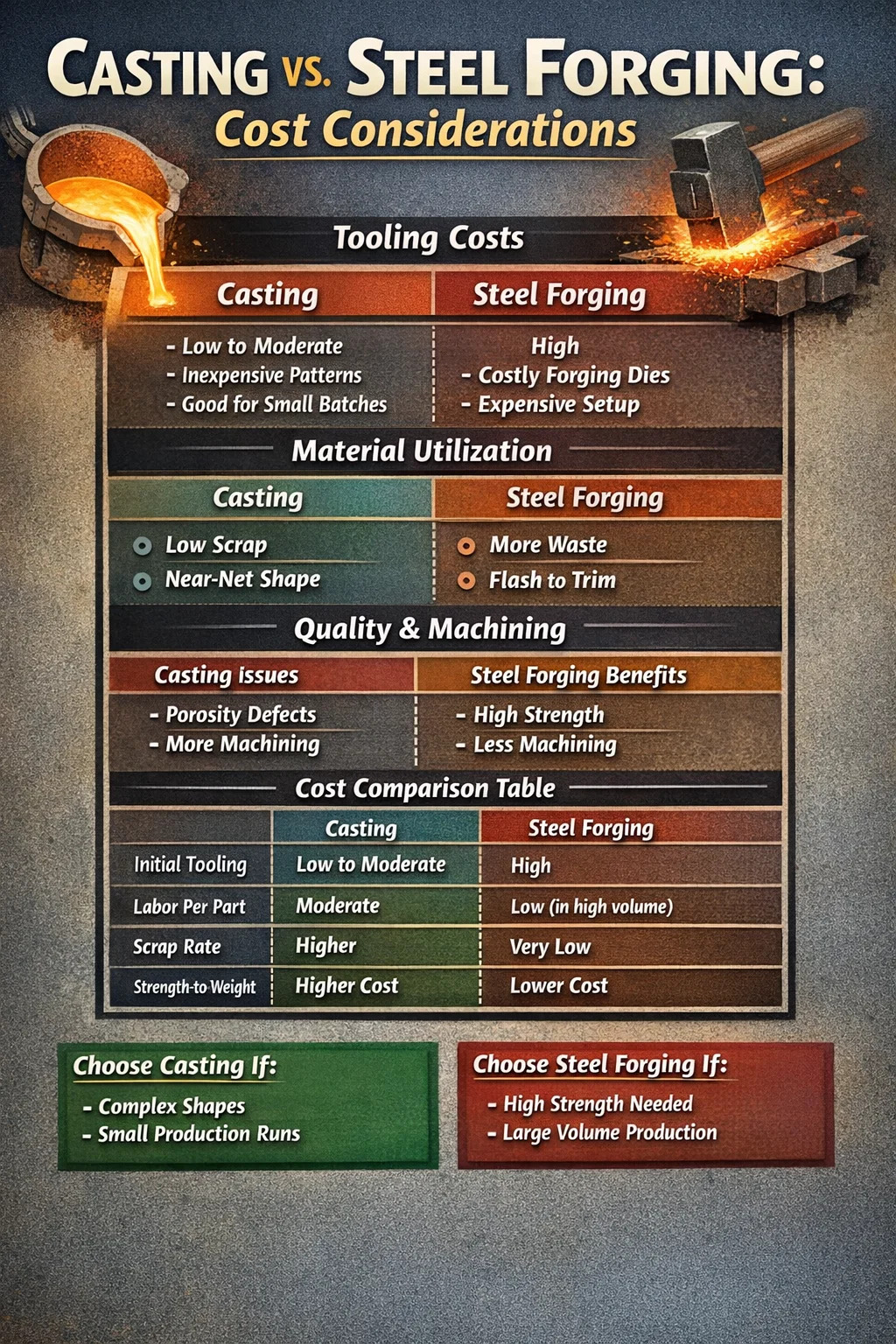 Ang pag-cast ay nagbibigay-daan para sa "near-net-shape" na produksyon. Dahil pinupuno ng likidong metal ang bawat siwang ng amag, napakakaunting scrap. Ginagawa nitong mas mura ang paghahagis kapag gumagamit ng mga mamahaling haluang metal. Sa kaibahan, pagpapanday ng bakal kadalasang nagreresulta sa "flash"—labis na metal na naiipit sa pagitan ng mga dies—na dapat putulin at i-recycle. Gayunpaman, para sa karaniwang carbon steel, ang halaga ng basurang ito ay kadalasang nababawasan ng higit na bilis ng pagpapanday ng mga martilyo.